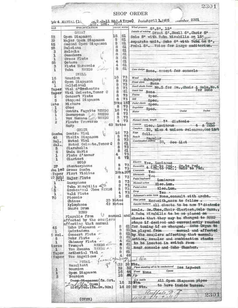 | Great 16 Open Diapason 8 Major Open Diapason 8 Second Open Diapason 8 Melodia 8 Gross Flute 8 Dulciana 8 Gemshorn 4 Octave 4 Flute Harmonic 8 Tuba Solo 8 Stentorphone 8 Gross Gamba 8 First Violins III 8 Major Flute 4 Wald Flute 2 Piccolo 8 Tuba Mirabilis 8 Saxophone (labial) 8 Orchestral Oboe Tremolo Chimes Xylophone Snare Drum |