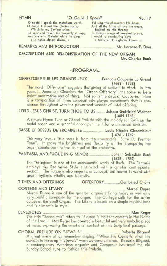 | Great 16 Pommer 8 Principal 8 Gemshorn 4 Octave 4 Pommer 2 Superoctave IV Fourniture Chimes Swell 16 Gedeckt 8 Gedeckt 8 Salicional 8 Celeste (TC) 4 Principal 4 Hohlflote 2 2/3 Nasard 2 Blockflote 1 3/5 Tierce III-V Plein Jeu 16 Trompette 8 Trompette 8 Oboe 4 Oboe-Clarion Tremolo Solo 8 Bombarde 8 Clarinet 8 English Horn Tremolo |