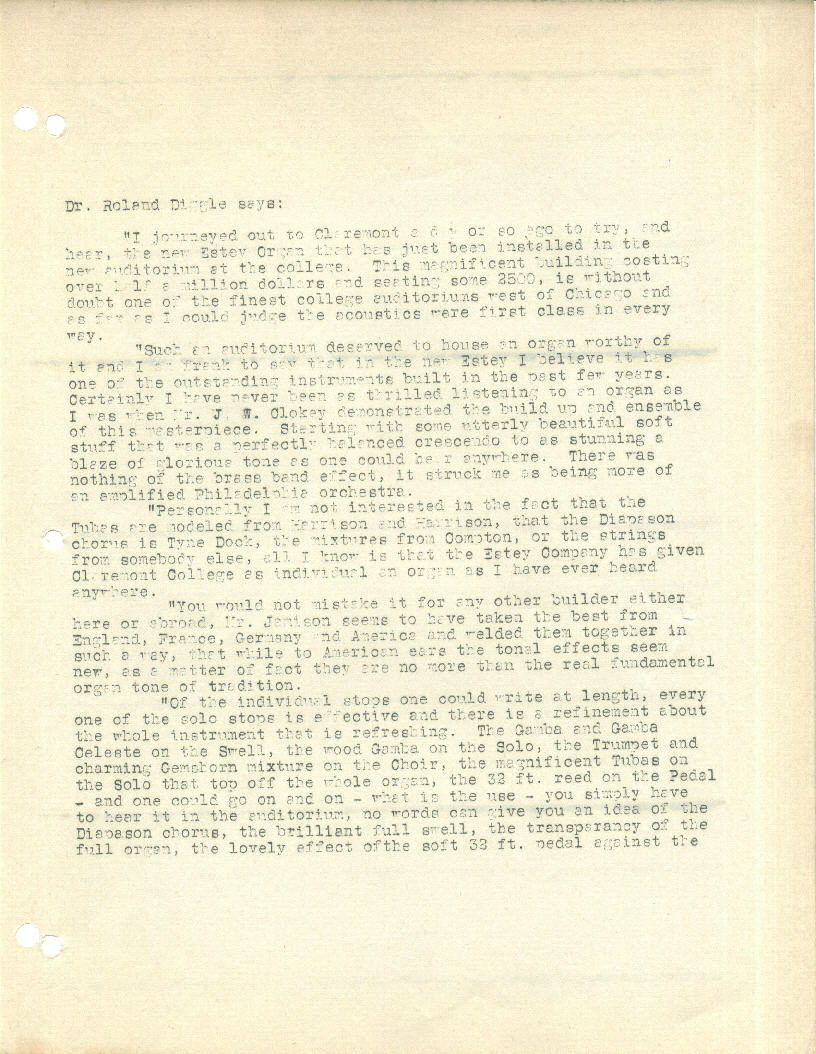 College, Claremont, CA. The auditorium and the organ were the gifts of